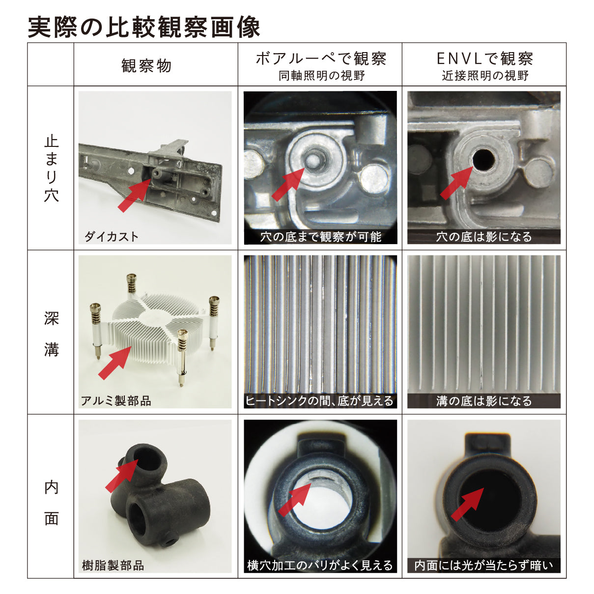 ・By using coaxial lighting, the human line of sight and the optical axis of the lighting are the same, making it possible to inspect inside holes where light cannot reach.
