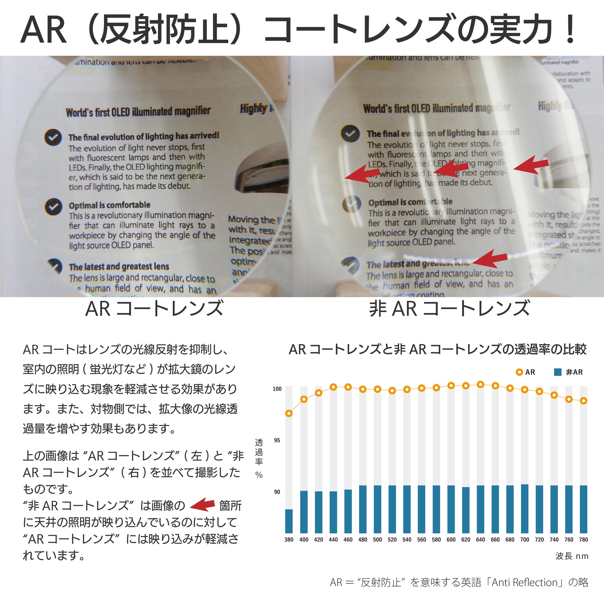 ・The lens uses an optical glass lens and has an AR coating on both sides. The AR coating suppresses reflections from external light on the lens surface, providing a brighter field of vision and is also effective in reducing fatigue.