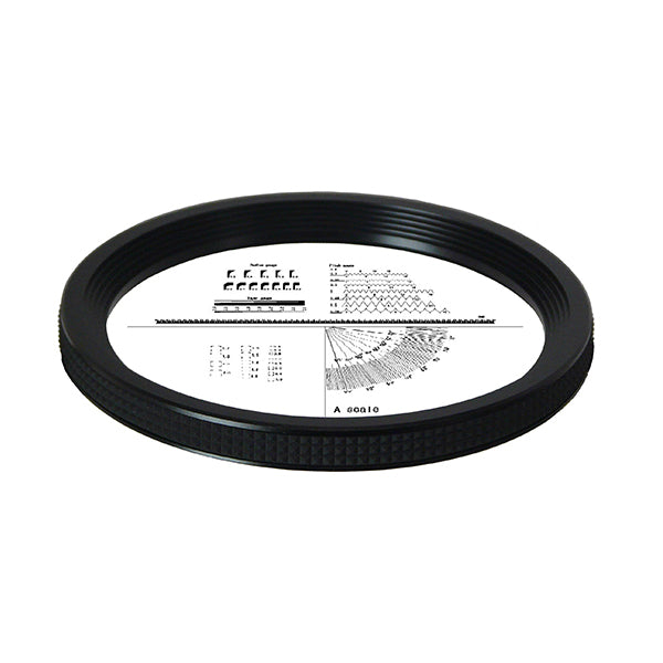 ・Φ76mmの円形ガラスの表面に6種類のスケールを描画してあり、外周のアルミ枠には使用感を考慮したゴムローレットが装着されています。