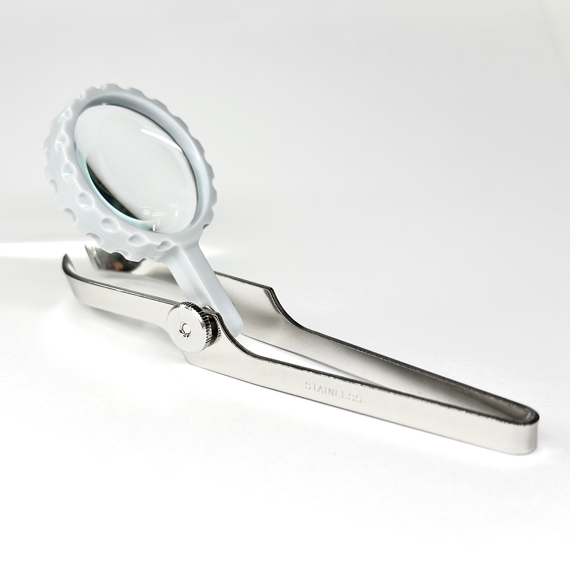 | 寸法 | ピンセット部分:横 約10.8cm × 縦 約1.2cm × 厚み 約1.5mm レンズ部分:レンズ径3cm ピンセットの取付部分からの高さ:約5.5cm 先端のとげ抜き部分の幅:約8mm |